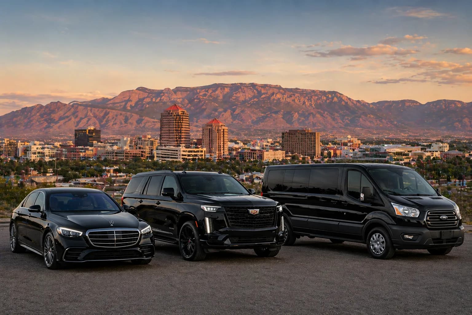 ABQ Sunport car service, corporate black car transportation, hotel transportation, hourly chauffeured service, and long-distance trips — chauffeured luxury across Albuquerque and the surrounding metro, and beyond.