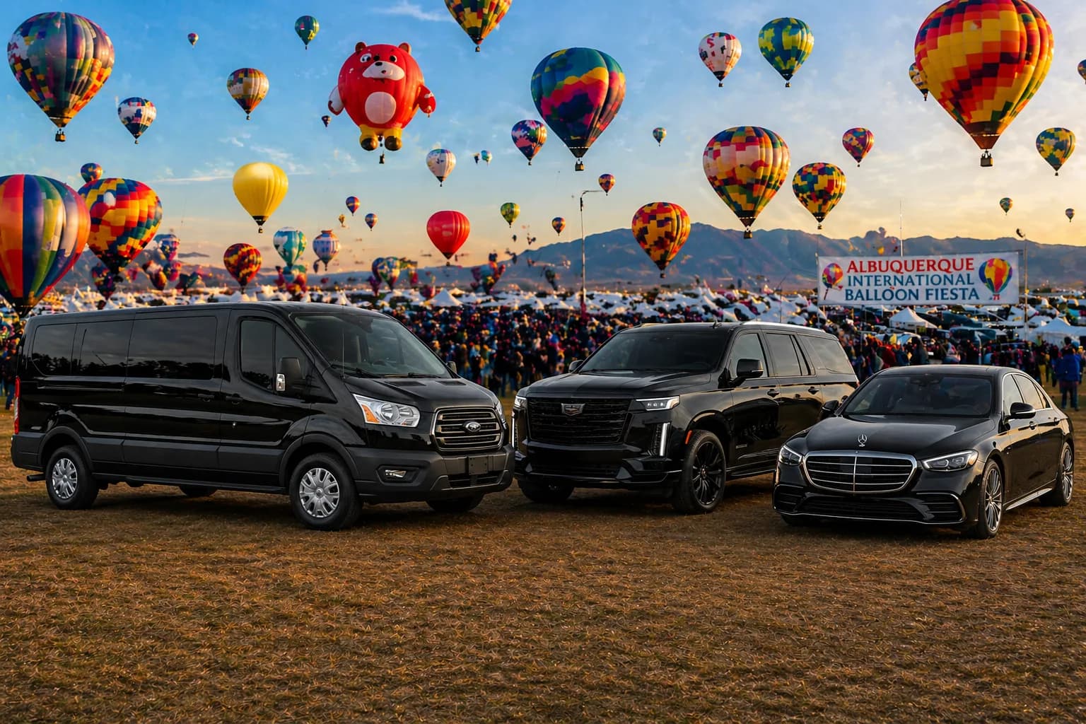 Dawn Patrol — the pre-Mass-Ascension warm-up where a small crowd of balloons lifts off in the dark at 5:45 AM — and Mass Ascension at 7 AM are the signature events of every Balloon Fiesta morning. Hotel-to-park logistics: 4 AM pickup at the hotel, 4:30 AM departure (Albuquerque hotels are 15–25 minutes from the park before traffic builds, longer once Alameda backs up), 5:00 AM commercial-livery drop-off at the park's authorized zone, photographers in position by 5:30 AM. We run continuous Dawn Patrol pickups through the 9-day event from every Albuquerque-area hotel — Hotel Albuquerque, Hyatt Regency Downtown, Embassy Suites, the Hilton Garden Inn cluster, the Hyatt Place at the Sunport, and surrounding North Valley properties. Pickup is at the same flat rate every day; no October surge multipliers.